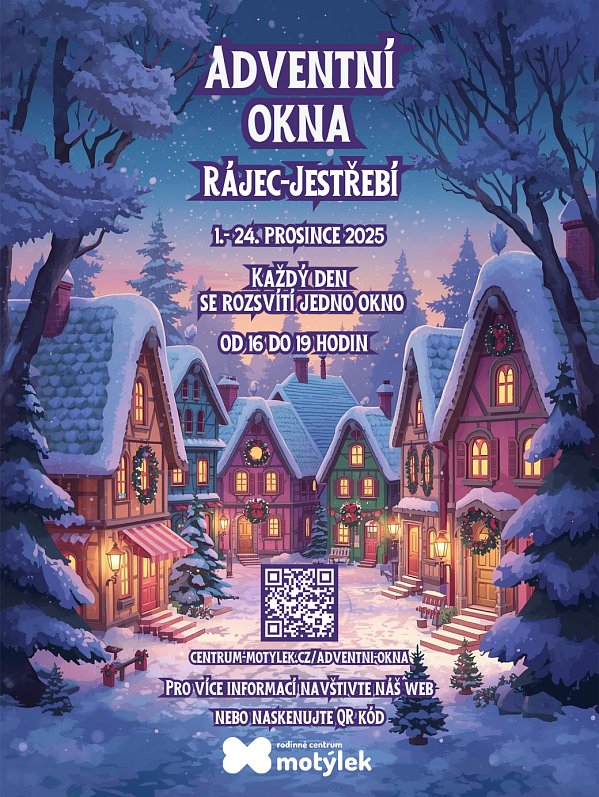 Rodinné centrum Motýlek Vás zve na adventní okna, každý den se rozsvítí jedno okénko od 1. 12. do 24. 12. 2025. Každé okno bude svítit ve svůj den. Okénko bude svítit vždy od 16:00 do 19:00. Více informací na webu https://www.centrum-motylek.cz/adventni-okna/